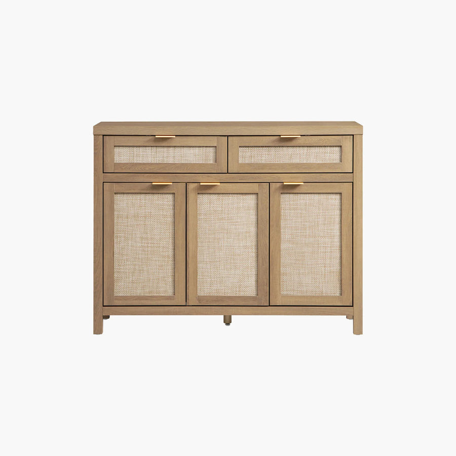 Modern sideboard with light wood frame, rattan panels, and gold handles on white background
