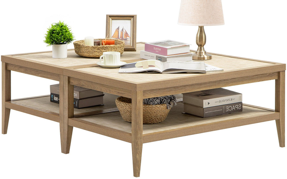 Wooden bookshelf with two open shelves and rattan cabinet doors on white background