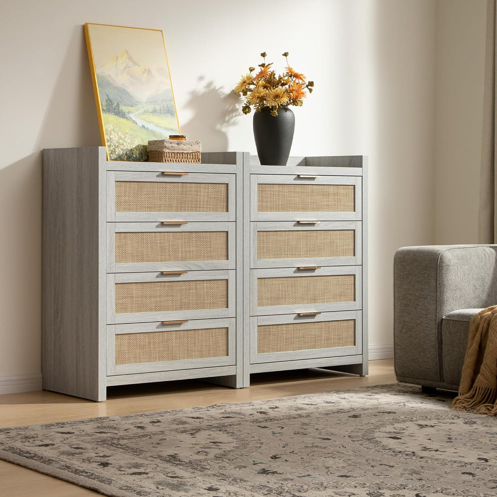 Light wood cabinet with two woven rattan doors, modern minimalist furniture on white background.
