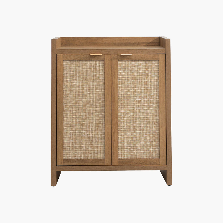 Modern wood accent cabinet with woven cane doors and drawer on white background
